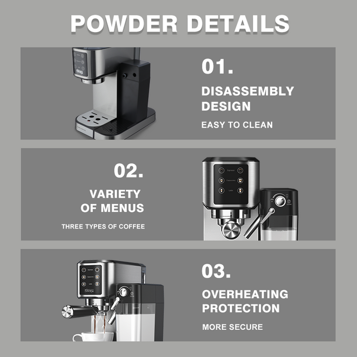 - خزانات الماء والحليب القابلة للإزالة وصينية تقطير قابلة للتعديل