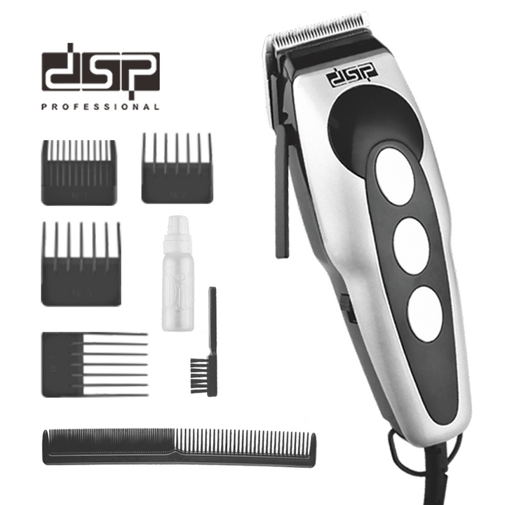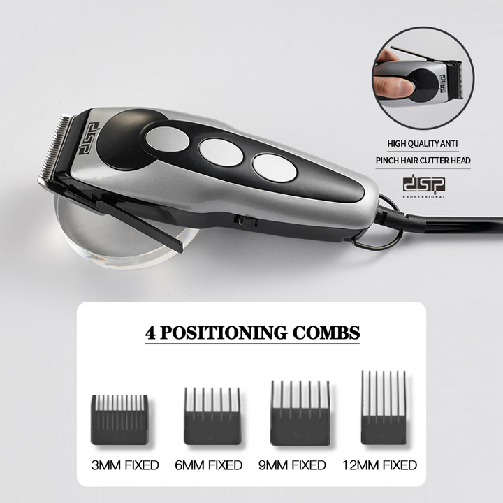 ماكينة حلاقة كهربائية احترافية تتميز بمحرك عالي الأداء وهادئ، وشفرات من التيتانيوم أو الفولاذ الخاص الحاد والمقاوم للصدأ، وهي مناسبة للحلاقة الدقيقة للوجه والجسم. تعمل بالكهرباء عبر سلك (10 واط، 220-240 فولت) ولها سرعة دوران تصل إلى 6000 دورة في الدقيقة، وتأتي مع ملحقات مثل فرشاة التنظيف وزيت التشحيم.